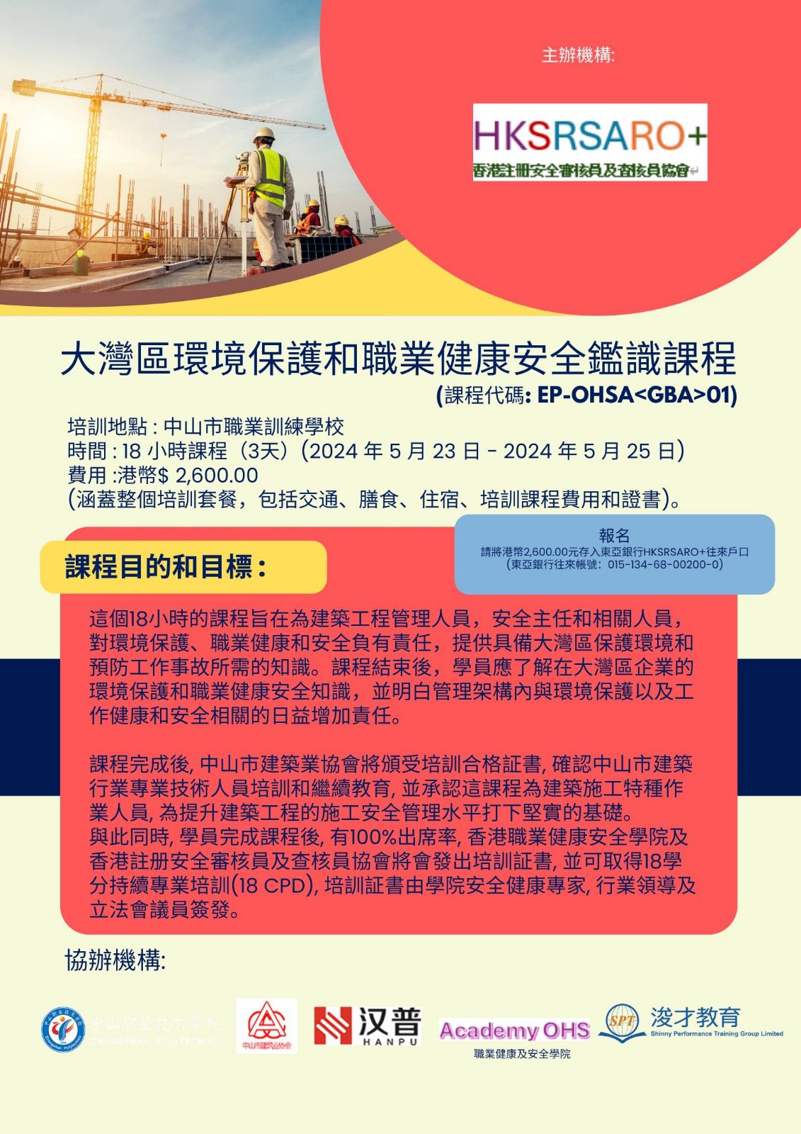 職業安全及健康課程 我們的職業安全及健康課程旨在提供學員全面的職場安全和健康知識。這個課程涵蓋了職業意外調查、工作地點嚴重事故的緊急應變及救援演練、工地管理人員安全訓練課程、職業安全管理和意外分析及預防嚴重工傷意外等方面的主題。通過專業的講師指導和互動學習,學員將學習到如何識別和減少職業風險、採取適當的安全措施、建立安全文化和推動健康促進等技能。 一般職業安全及健康課程(職業意外調查)一般職業安全及健康課程(職業意外調查) 職業意外調查 Co ...Read more一般職業安全及健康課程(工作地點嚴重事故的緊急應變及救援演練)一般職業安全及健康課程(工作地點嚴重事故的緊急應變及救援演練 ...Read more職業安全及健康管理課程(工地管理人員安全訓練課程)職業安全及健康管理課程(工地管理人員安全訓練課程) 工地管理 ...Read more職業安全及健康管理課程(職業安全管理)職業安全及健康管理課程(職業安全管理) 職業安全管理 為了有 ...Read more職業安全及健康管理課程(意外分析及預防嚴重工傷意外)職業安全及健康管理課程(意外分析及預防嚴重工傷意外) 意外分 ...Read more 大灣區職業安全課程